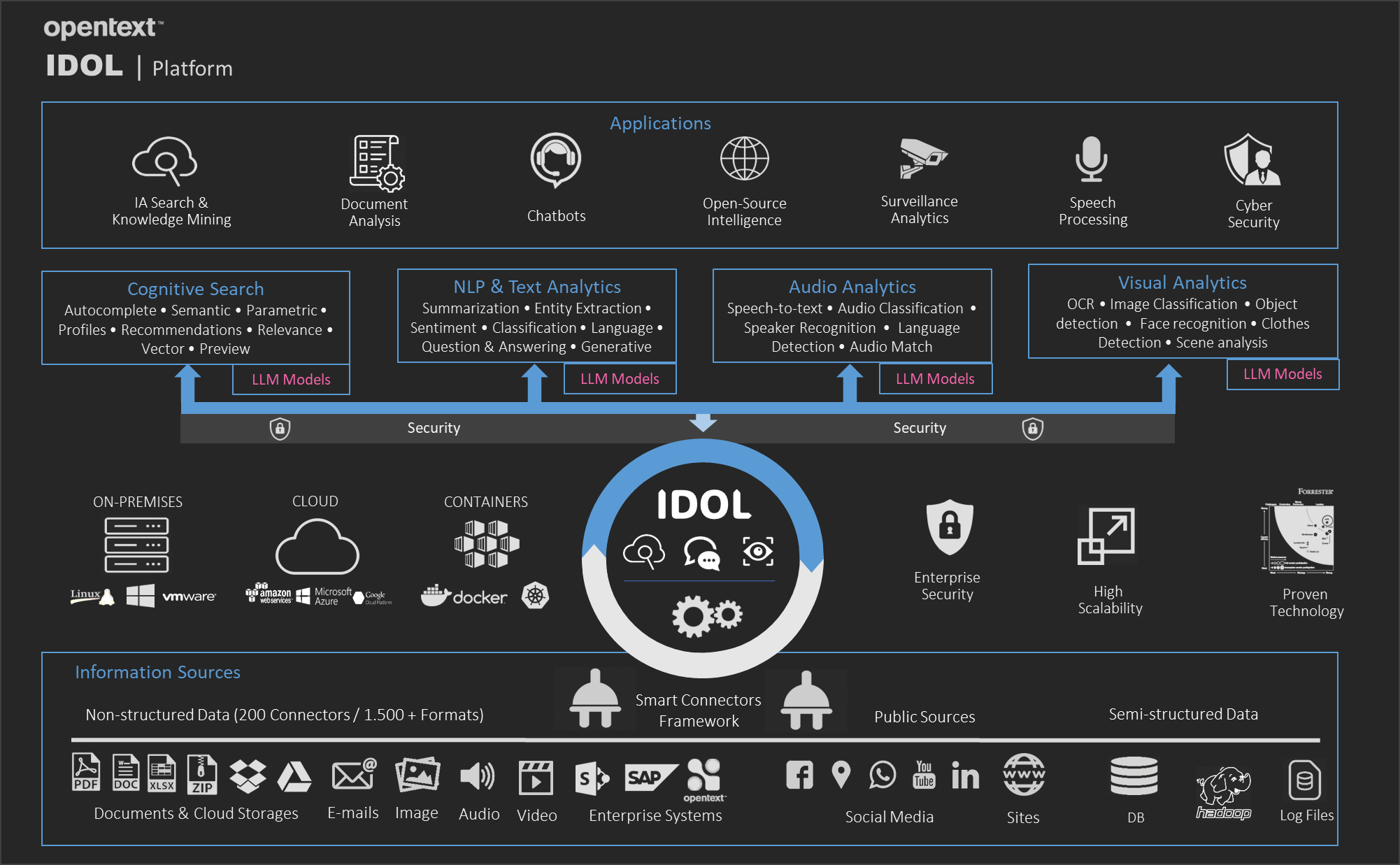 IDOL fornece uma plataforma unificada de IA para analisar dados não estruturados de texto, áudio, vídeo e imagem. Com suporte para integração de dados de mais de 200 repositórios corporativos, fontes abertas e o analisador de arquivos mais poderoso do mercado com capacidade de extrair dados de mais de 1.500 formatos, o IDOL permite quebrar barreiras de integração e aplicar modelos de IA avançados (LLM ) para identificar padrões, enriquecer conteúdos, detectar e consumir informações relevantes de forma simples e imediata em linguagem natural (NLP). Tudo isso mantendo as mais rigorosas políticas de segurança da informação e processos de compliance