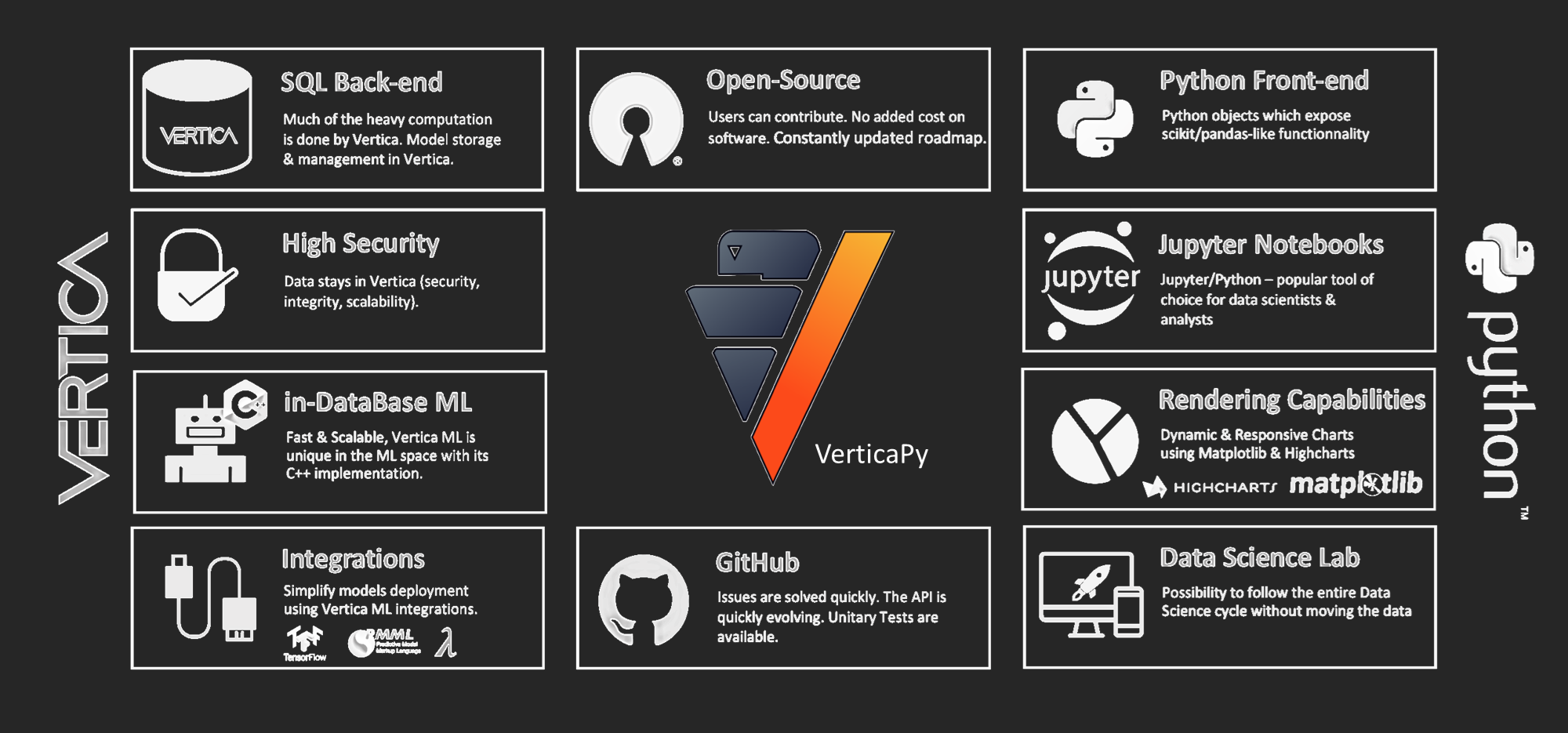 - VerticaPy. É uma biblioteca Python com funcionalidade semelhante ao scikit usada para conduzir projetos de ciência de dados em dados armazenados no Vertica, aproveitando a velocidade do Vertica e recursos integrados de análise e aprendizado de máquina. O VerticaPy oferece suporte robusto para todo o ciclo de vida da ciência de dados, usa um mecanismo de ‘pipeline’ para sequenciar as operações de transformação de dados e oferece belas opções gráficas.